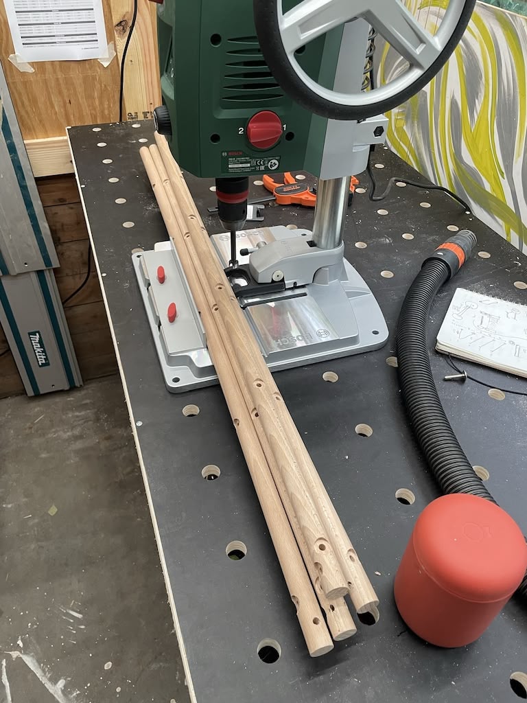 Since I was using decorative pan head screws, I needed both through holes (for the screw shafts) and counterbores (for the shiny heads) along the dowels. Free-handing with a drill worked about as well as you might expect — turns out it’s very obvious when a 15mm diameter counterbore isn’t exactly centered on a 20mm diameter dowel — so I ended up buying a benchtop drill press: