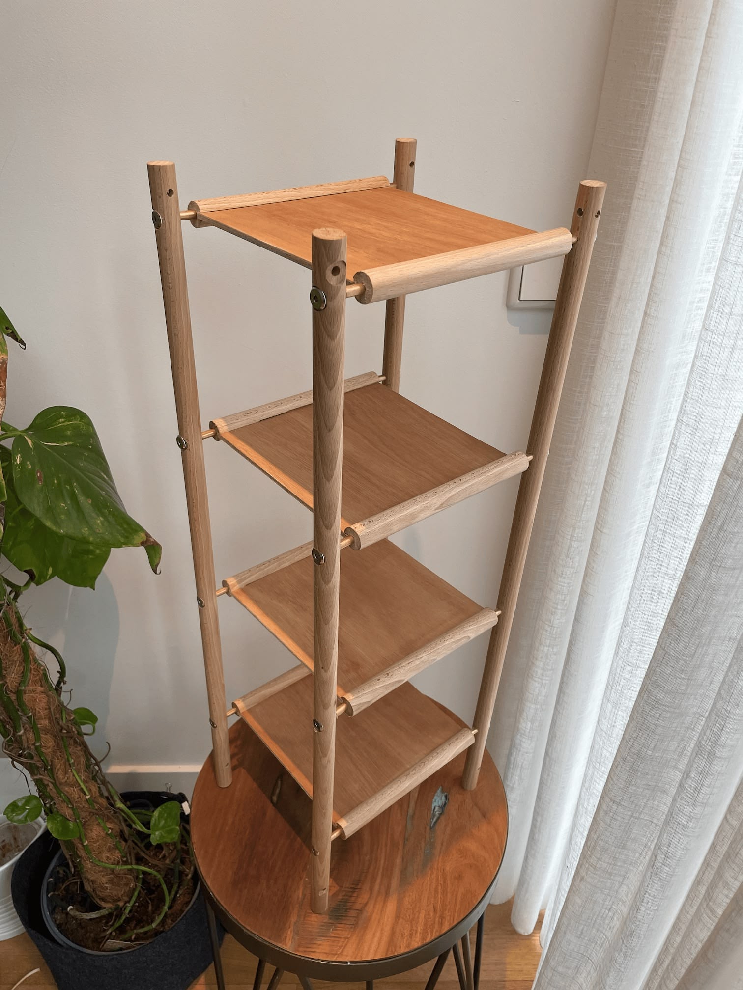 After much drilling, I decided there was absolutely no way I was going to enjoy building a shoe tower using dowels (much less an entire bedroom storage system), so I demoted this prototype down to “plant stand”, which ended up turning out OK: