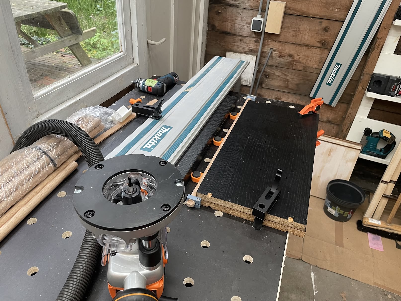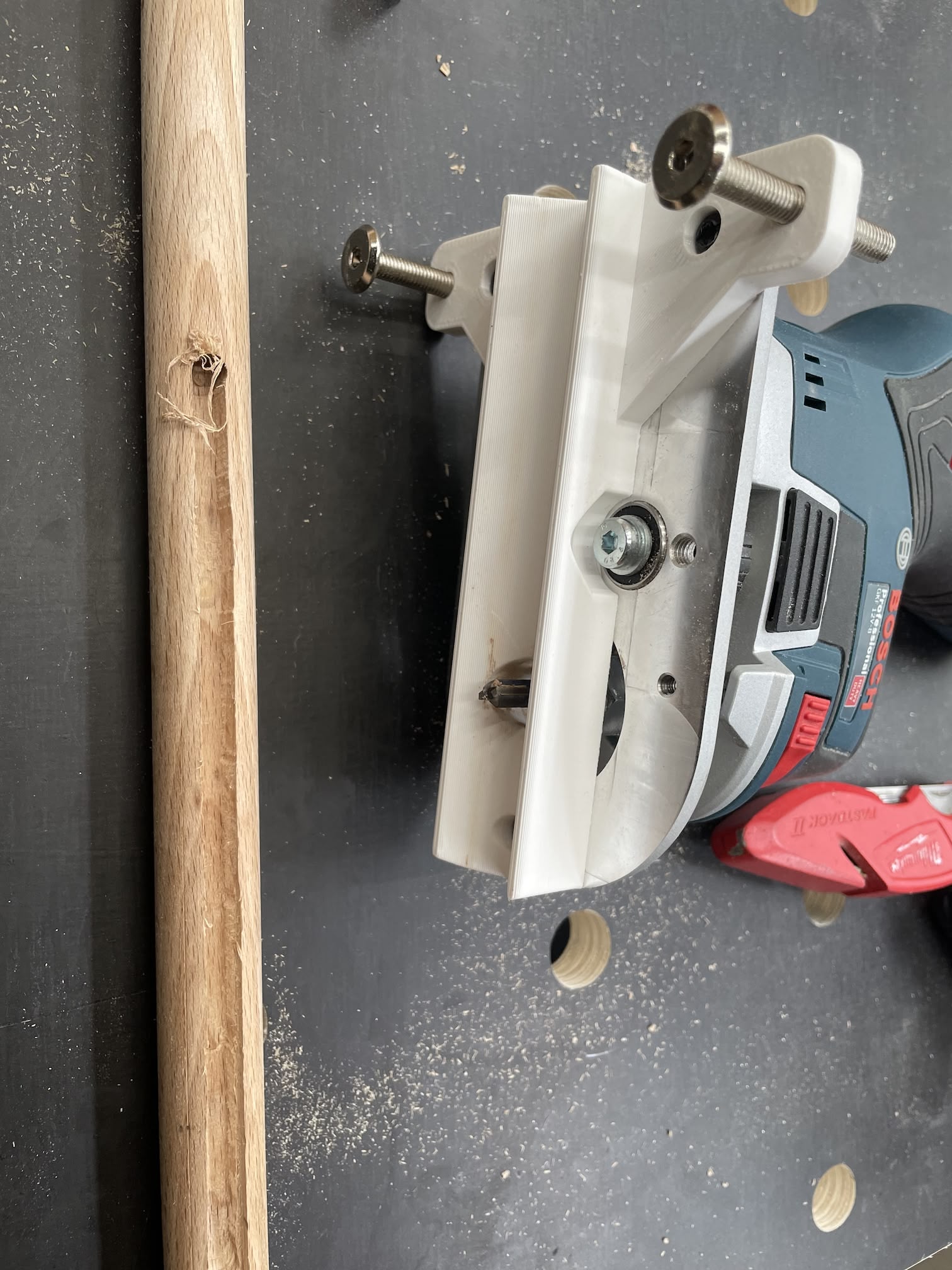 This Bosch PBD 40 has some awesome features like electronic speed control and digital depth readout. Unfortunately, it also came with noticeable wiggle in the chuck and about 1mm deviation between the base plate’s v-groove and the drill center, both of which make it impossible to throw material down and get a repeatable hole location — you have to carefully line everything up first.