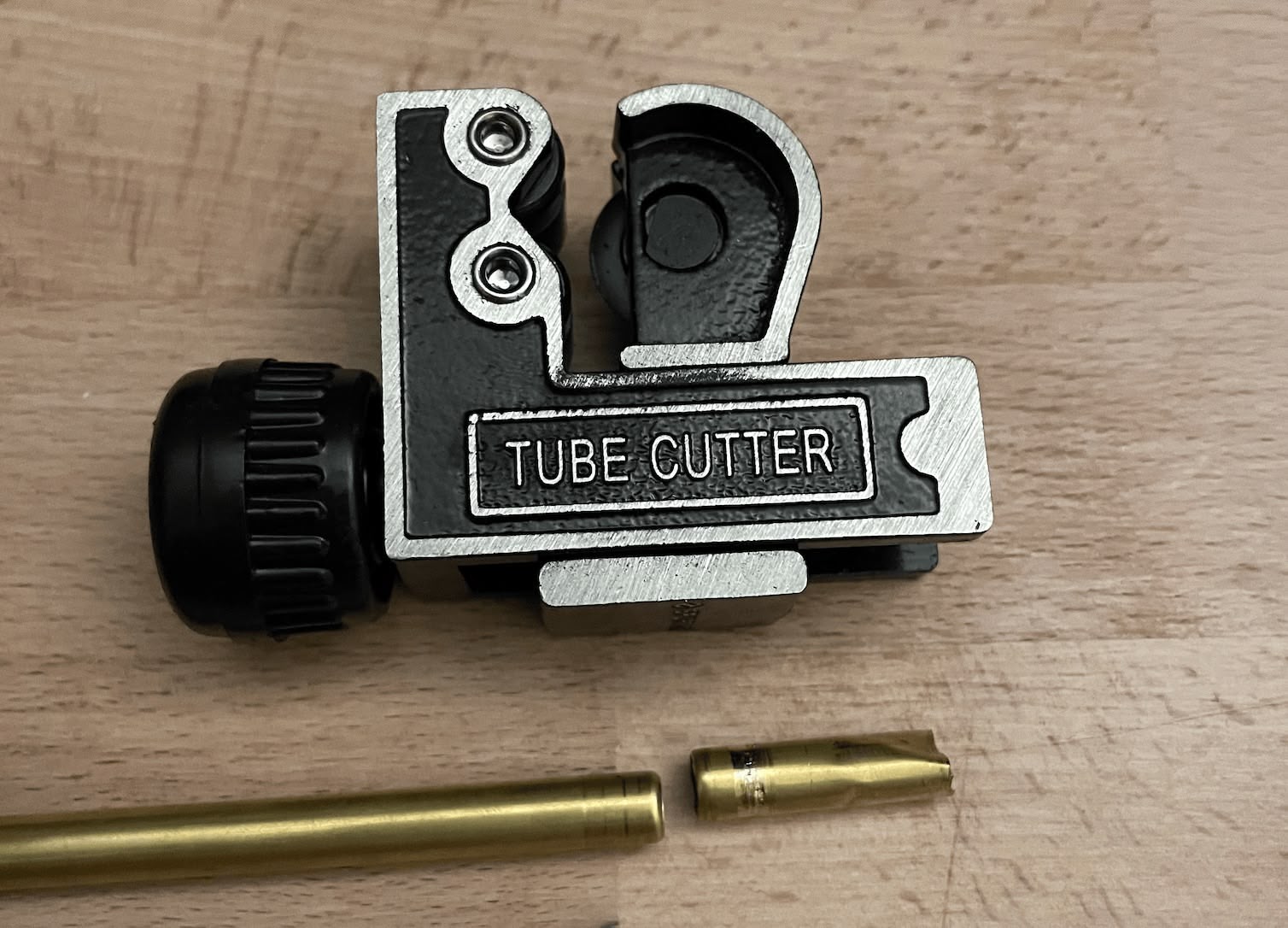 I used brass tube to hide the screw threads. Originally I thought I’d be able to easily cut brass tube with a hacksaw — turns out absolutely not; brass is way too gummy and it’s impossible (for me, anyway) to maintain a consistent cut line by hand. Luckily, I found one of these $10 things which, pleasingly, is extremely good at its one job: